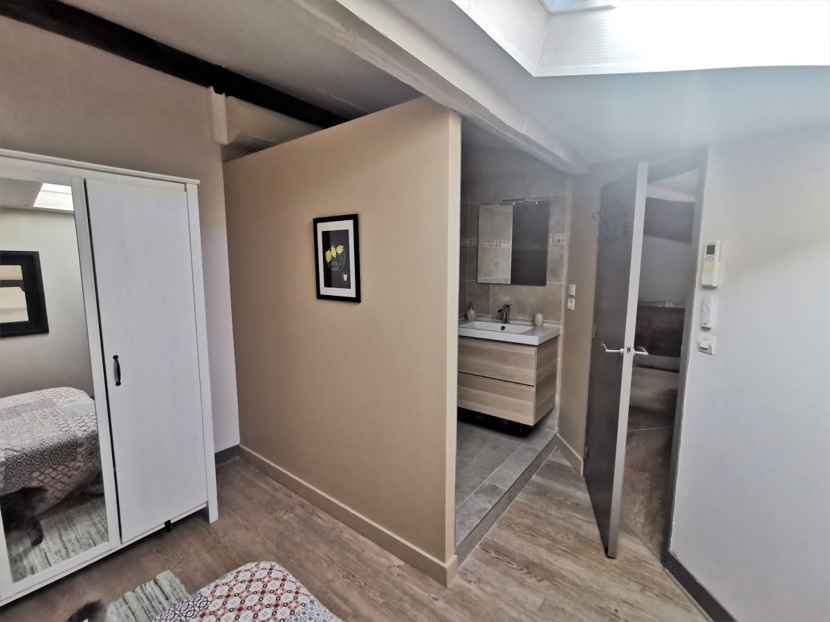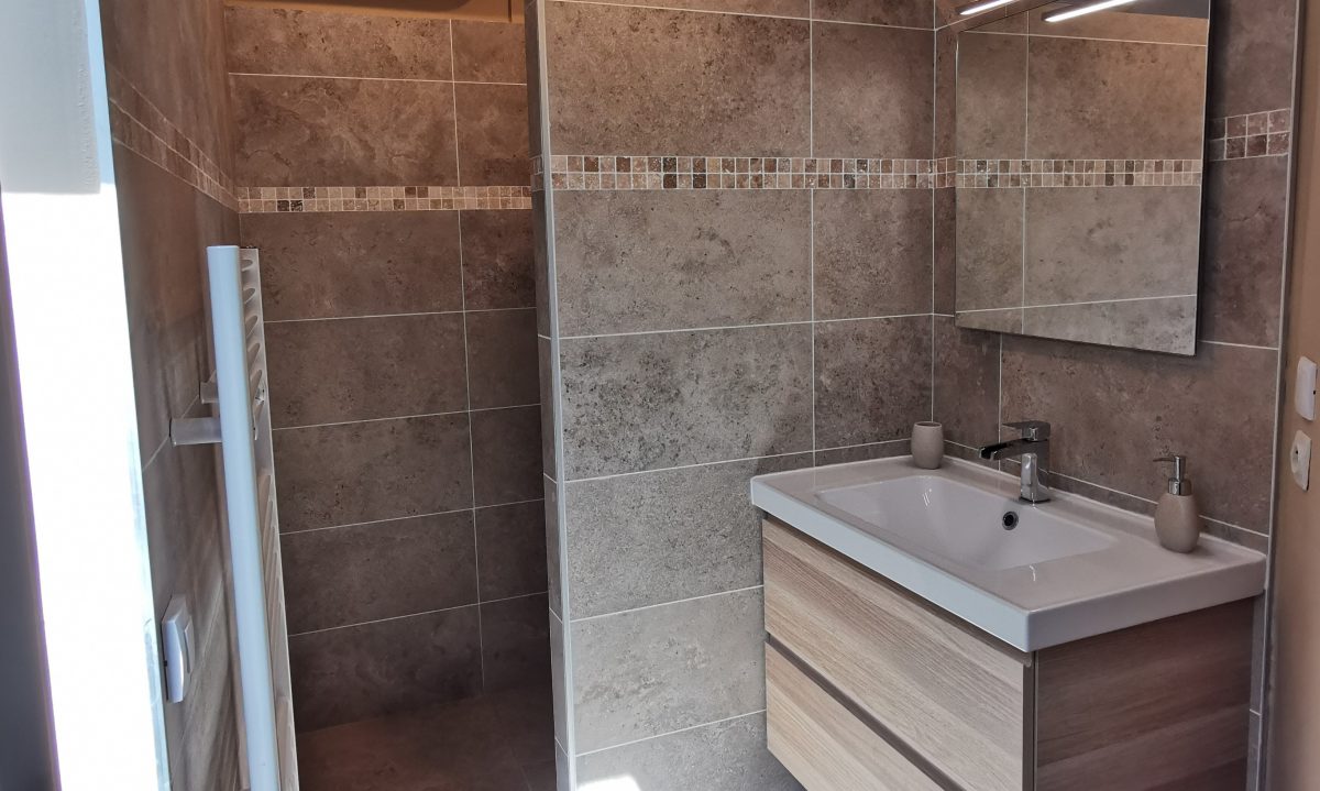Nous avons accompagné ce couple dans la rénovation d’une salle d’eau ouverte sur la chambre d’amis. Elle était jusqu’alors très spartiate et faisait penser à une chambre de bonnes pour étudiants. Nous avons donc créé une cloison pour délimiter l’espace salle d’eau du reste de la chambre (espace trop restreint pour véritablement fermer la salle d’eau).