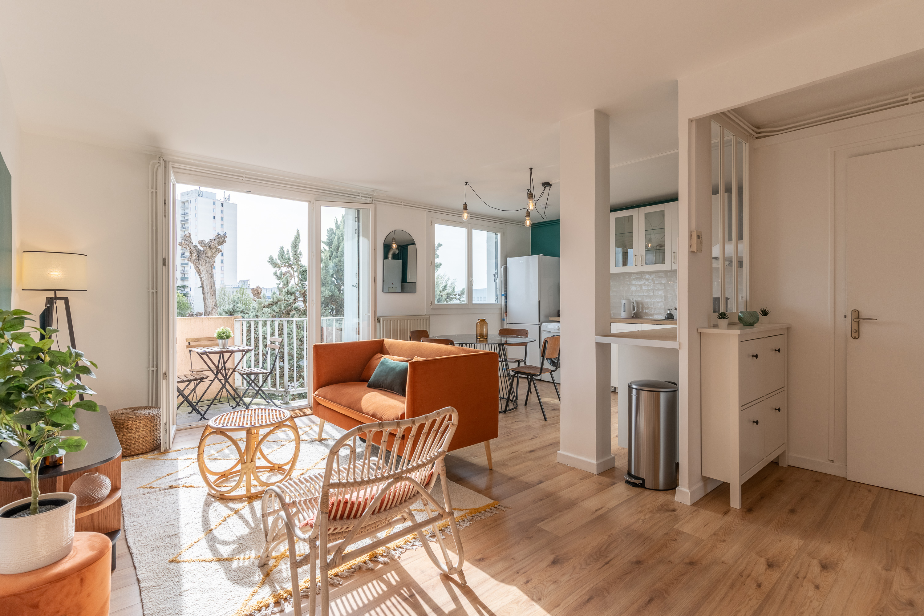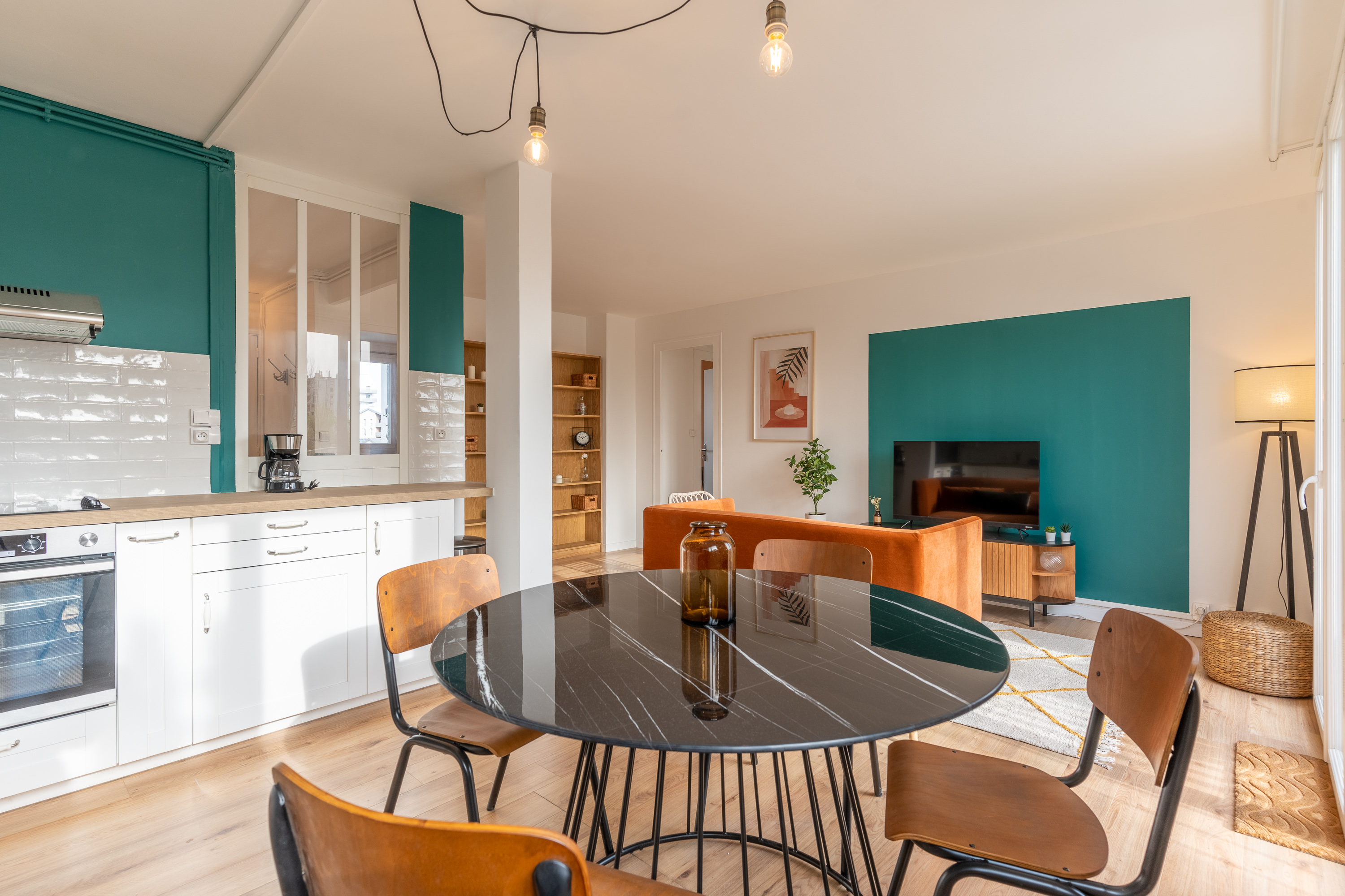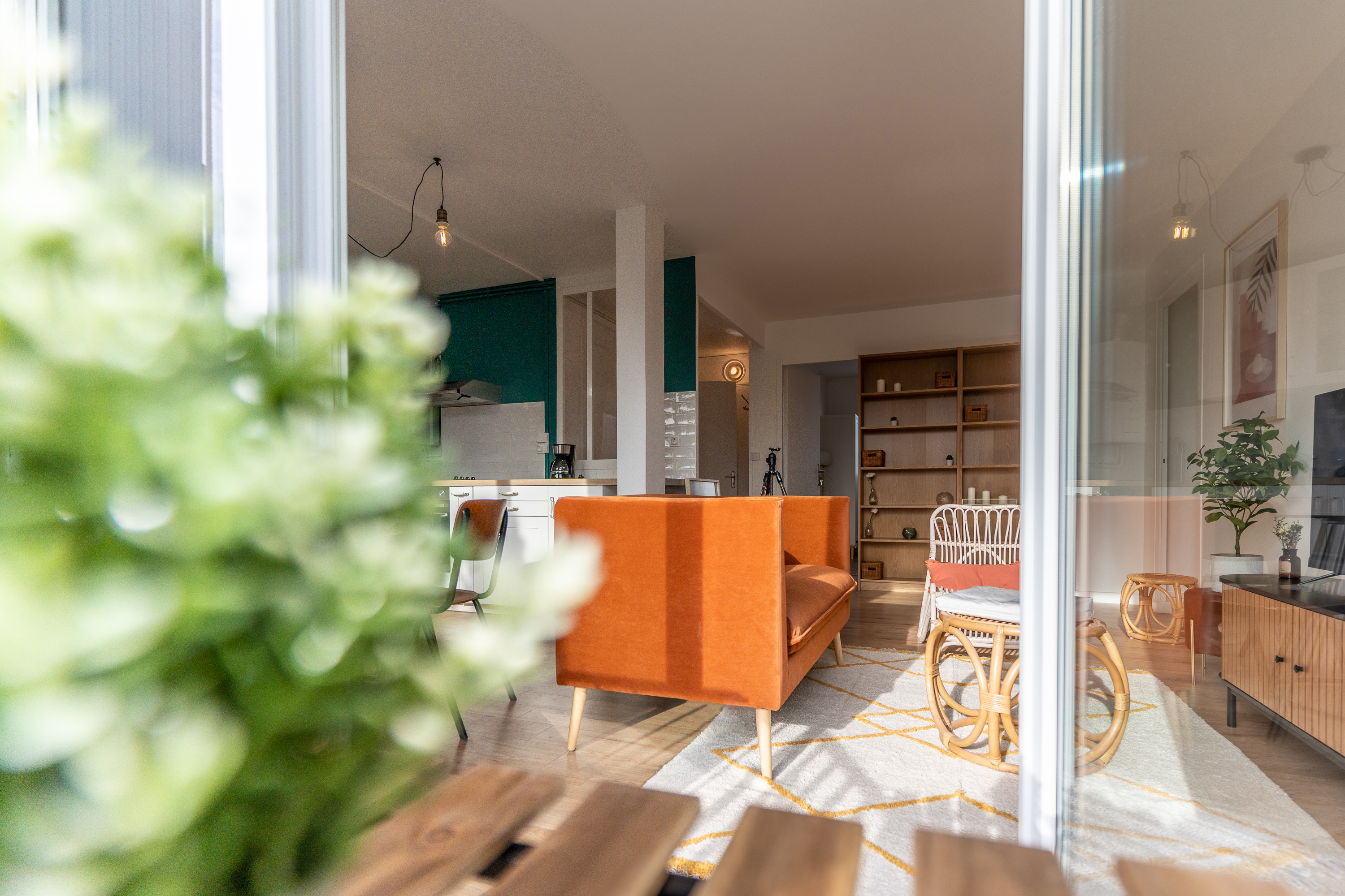 En termes de décoration, nous avons donné un côté rétro à cet appartement en jouant sur des peintures vives mais chaleureuses comme l’orange et le vert émeraude, ainsi que sur des matériaux vintage comme le rotin, le velours, le carrelage imitation carreaux de ciment…