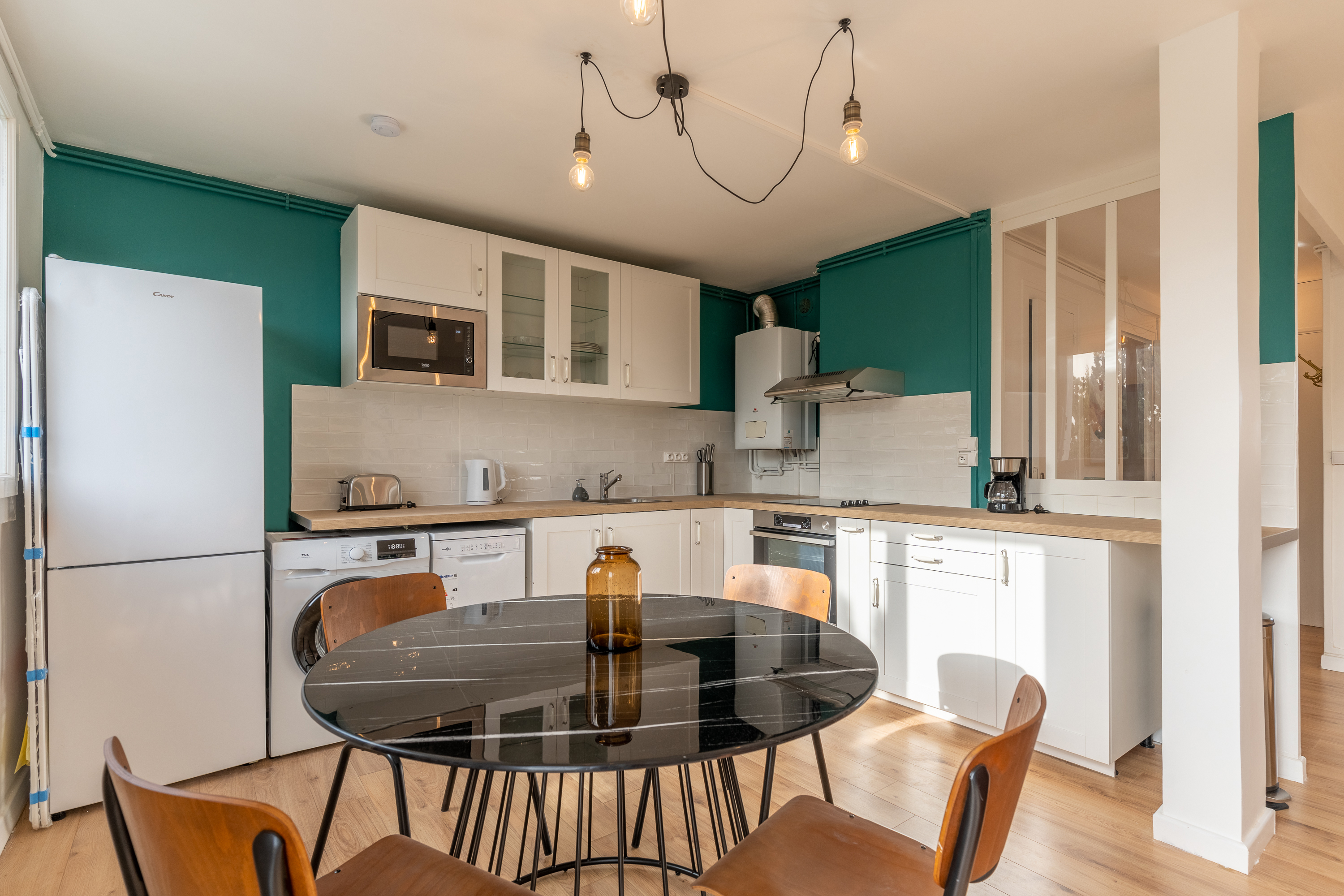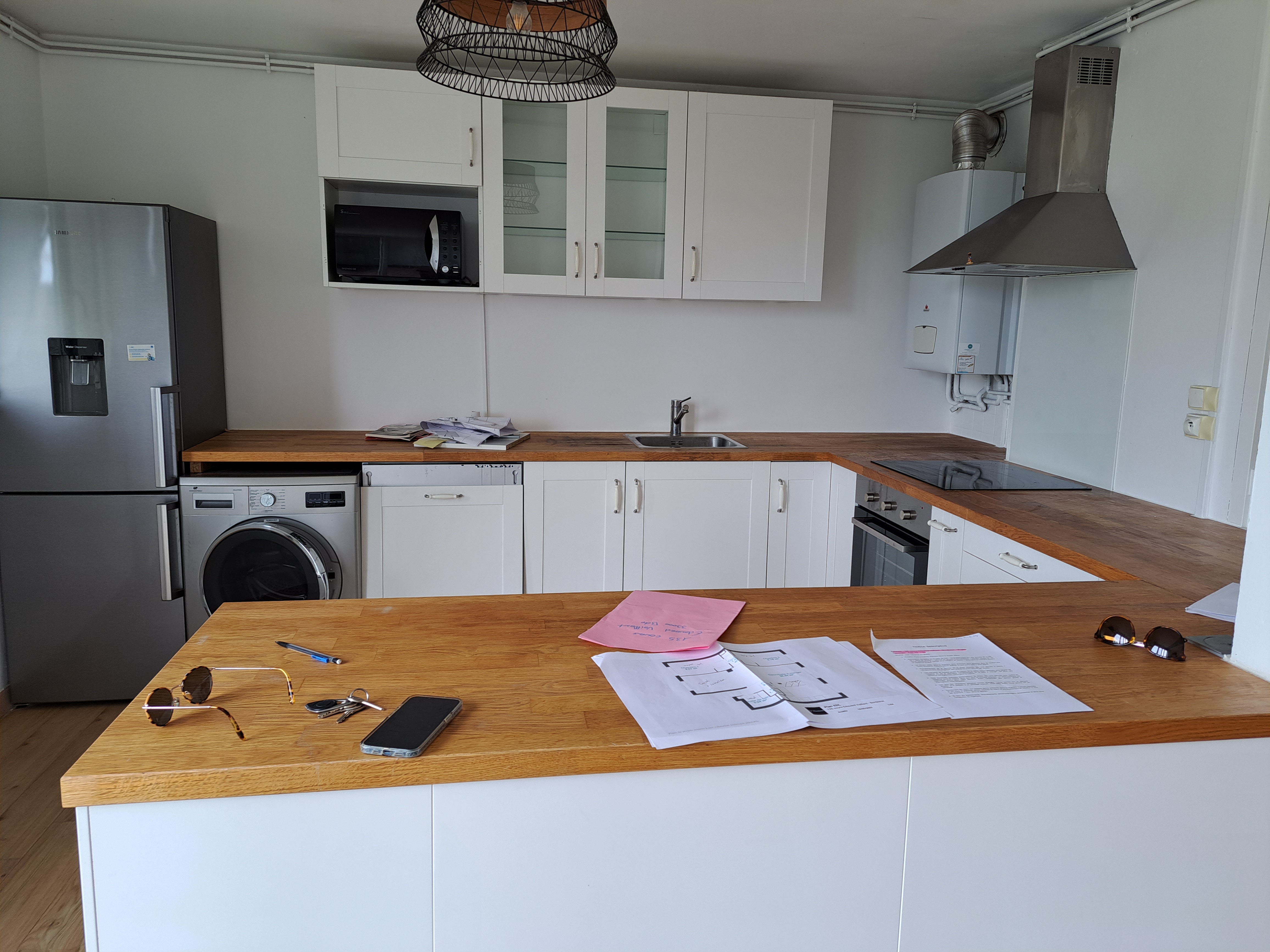 La pièce de vie a été réagencée en déposant notamment une partie des meubles bas de la cuisine (retour en U) afin de gagner de l’espace de circulation et permettre l’emplacement d’un coin salle à manger.