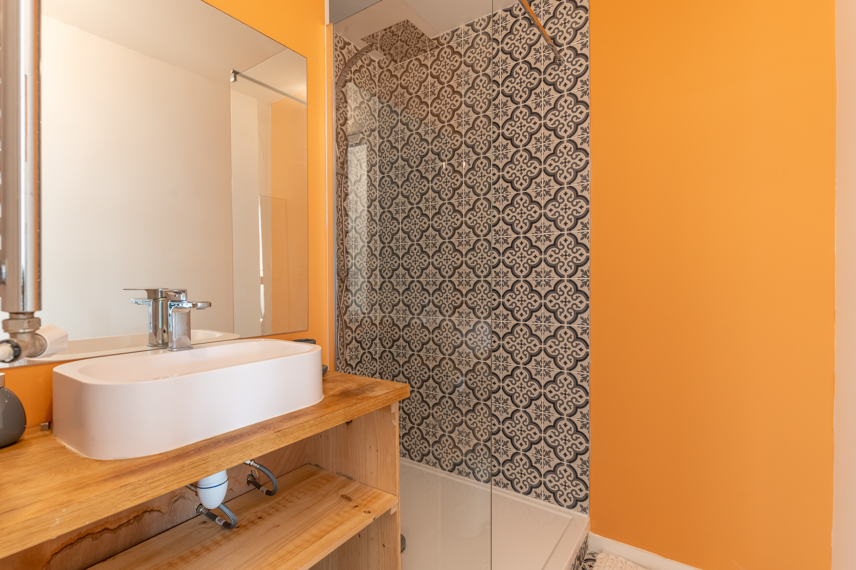 La salle de bains a également subi un rafraichissement avec notamment l’installation d’un bac à douche extra plat à la place de la baignoire d’origine.